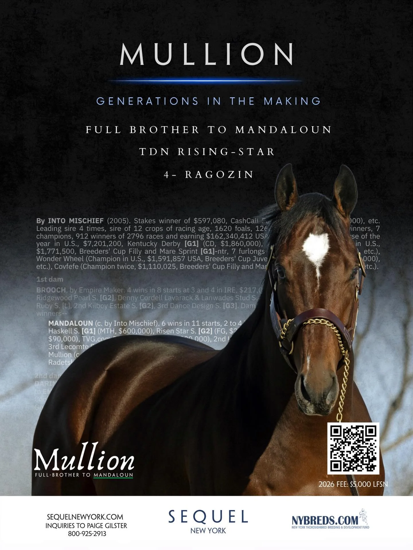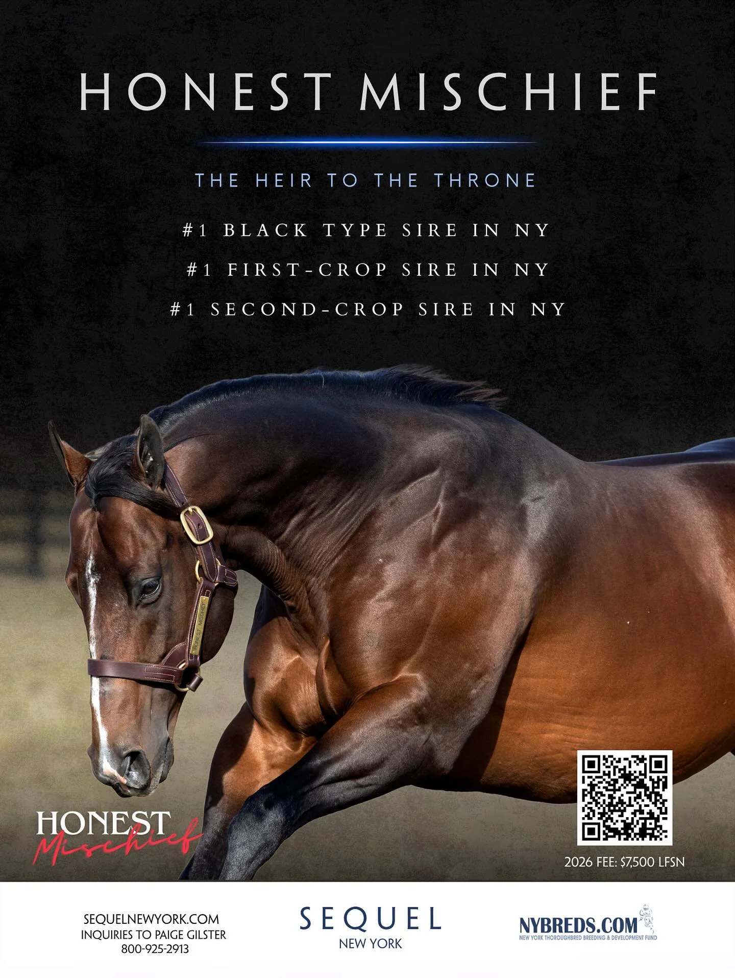 Established in 2000, Sequel calls 223 pristine acres in Hudson, New York home. Sequel is the home of HONEST MISCHIEF, Leading First Crop Sire outside of Kentucky and New York’s first son of INTO MISCHIEF. MULLION, Full brother to Kentucky Derby winner, Mandaloun and FIRE AT WILL, Breeders Cup Champion. Sequel’s Newest Stallion for 2026 is multiple Graded Stakes Winning Millionaire, NEWGRANGE!